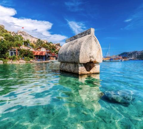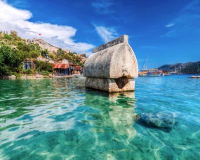 Затонувший город Кекова. Пересядем на яхту и отправимся к руинам древнего города. Он частично ушёл под воду после сильного землетрясения. Под прозрачной водой можно различить стены домов, лестницы и остатки улиц.